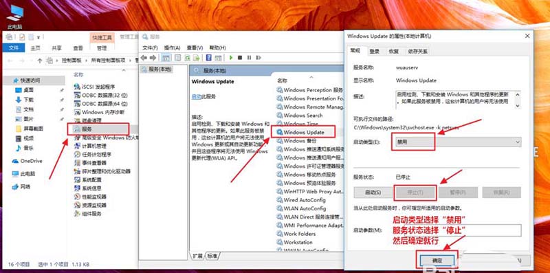6、服務——windows update——禁用——停止——確定(操作這個步驟后應用商店無法使用,如要使用應用商店跳過此步驟)