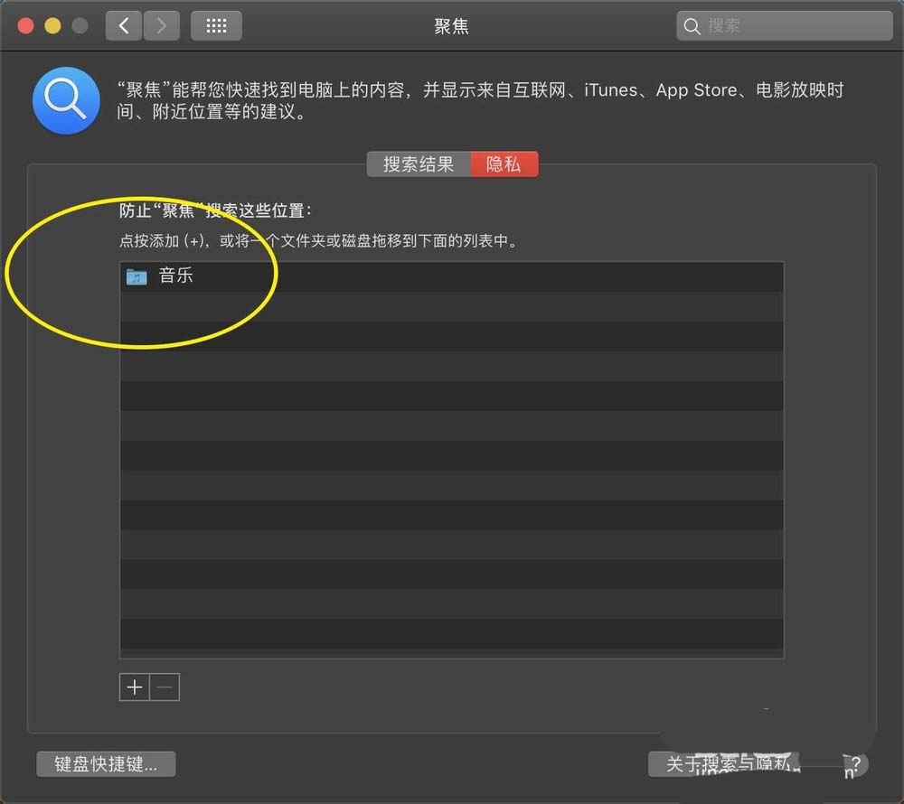7、那么此時文件夾會出現(xiàn)在聚焦隱私上,那么使用聚焦搜索,就不會搜索到這個排除的文件夾。