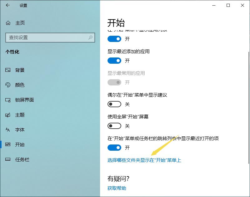 5、然后點擊選擇哪些文件夾顯示在“開始”菜單上;