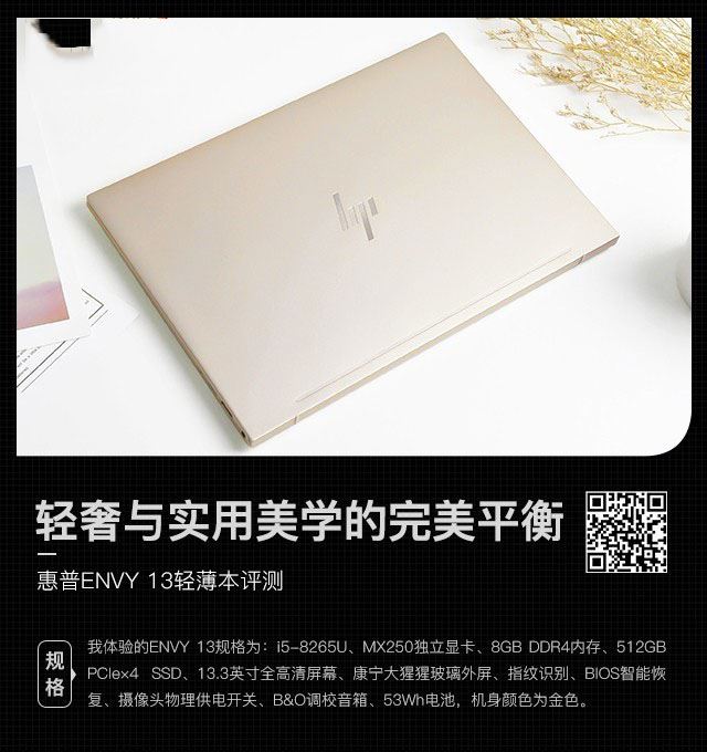 作為今年備受矚目的“輕奢型”輕薄本,ENVY 13有著與眾不同的氣質,我在體驗之后也被其深深吸引。我體驗的ENVY 13規格為:i5-8265U、MX250獨顯、8GB DDR4內存、512GB PCIe×4 SSD、13.3英寸全高清屏幕、康寧大猩猩玻璃外屏、指紋識別、BIOS智能恢復、攝像頭物理供電開關、B&O調校音箱、53Wh電池。