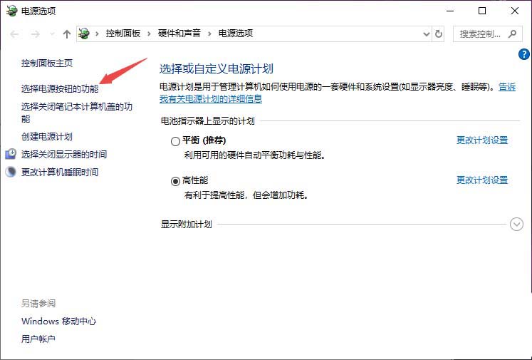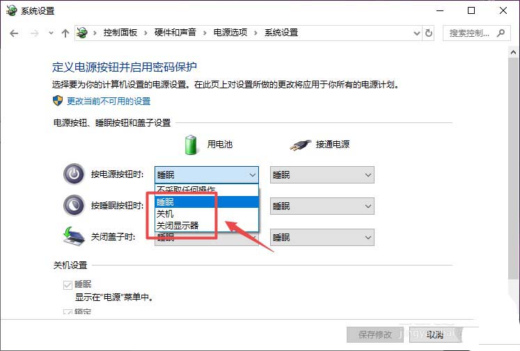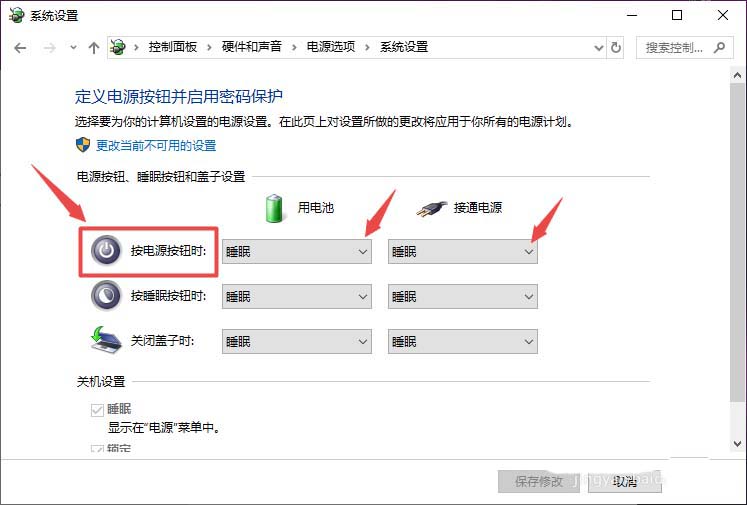 7、之后我們便可以看到按電源按鈕時的功能設置,我們點擊后面的下拉箭頭;