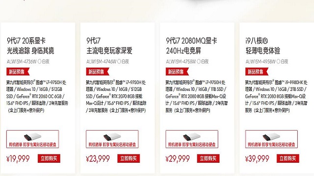 i9-9980HK + RTX 2080 Max-Q + 16GB + 2TB SSD:39699/39999 元(月球暗面/白夜)