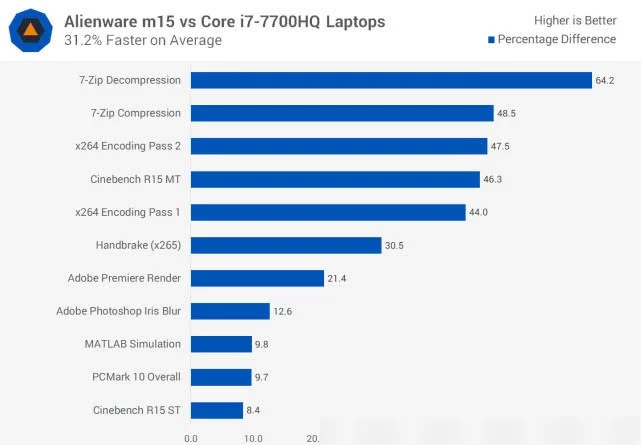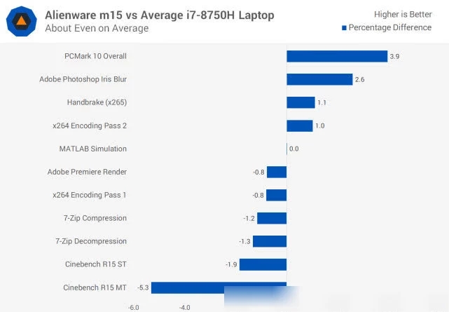 說到CPU性能,我們知道大多數其他旗艦游戲筆記本電腦都使用相同的酷睿i7-8750H處理器,所以我們主要考慮的是外星人M15與競爭對手之間的對比,在生產力方面是否有什么不同。我們發現,M15筆記本的性能與我們的平均8750H跑分的成績數字基本相同,表明系統運行情況正常。在每個工作負載中,有時會慢一些,有時會快一些,但是從平均表現來看,這里沒有什么需要擔心的。