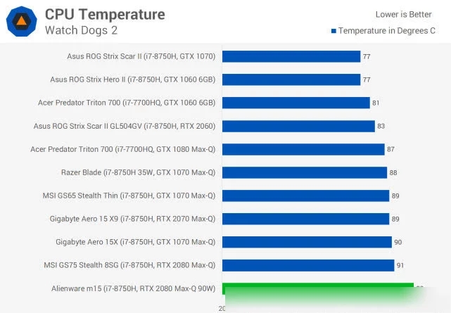 這里的數據顯示外星人M15的散熱解決方案不能滿足內部硬件的要求。雖然顯卡的溫度沒有太大的問題,84華氏度對大多數游戲筆記本電腦來說是可以的。但真正讓人抓狂的是CPU溫度,在《看門狗2》游戲測試中,M15的溫度達到了99華氏度,當任何時候一臺筆記本電腦的溫度超過100華氏度時,你就會感覺發熱了。