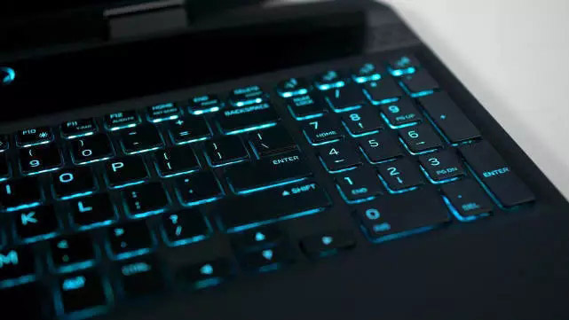 在其他方面,外星人做了很多正確的事情。比如它的鍵盤設計非常不錯,雖然觸覺反應手感有點像海綿狀,但整體的布局很好,它包括一個完整的數字鍵盤加上四個宏按鍵。整個鍵盤由四個RGB背光照明區域組成,另外還有另外兩個RGB照明元素:分別是電源按鈕和上蓋外側的外星人Logo,都可以發光。