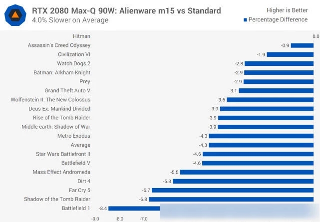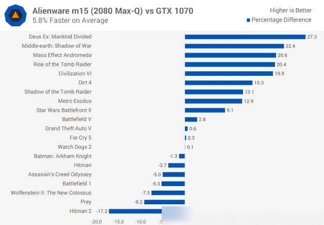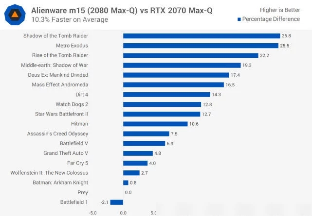 另一個可選的顯卡配置是RTX 2060。在這里,RTX 2080 Max-Q的平均速度提高了16%,盡管它并不是每場對比都能獲勝。例如,與我們測試過的其他筆記本電腦的平均結果相比,《刺客信條2》中外星人M15的速度特別慢。但另一方面,在像《中土世界:戰爭之影》這樣的游戲卻中有著明顯的領先優勢,2080 Max-Q的速度提升超過了30%。