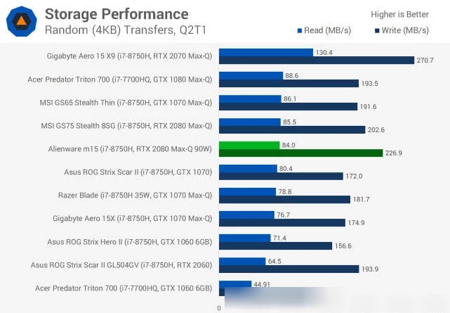 在存儲性能方面,外星人M15配備了512GB的SK Hynix PC401 SSD固態硬盤,性能表現非常好,沒有任何問題。它雖然不是我們所見過讀取最快的游戲筆記本SSD固態硬盤,尤其是對于連續工作負載來說,但對于大多數人來說已經足夠了。