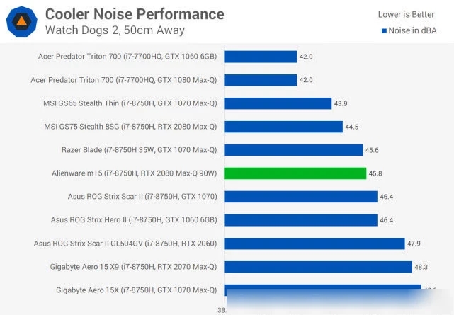 所以外星人M15無法更快的讓風扇進行散熱也就不足為奇了:我們在游戲負載時已經達到了46 dBA,這對于一臺游戲筆記本電腦來說是比較高的。所以整個系統又熱又吵,基本上沒有移動的空間。如果你想讓整個系統超頻,基本上沒有太大的空間。