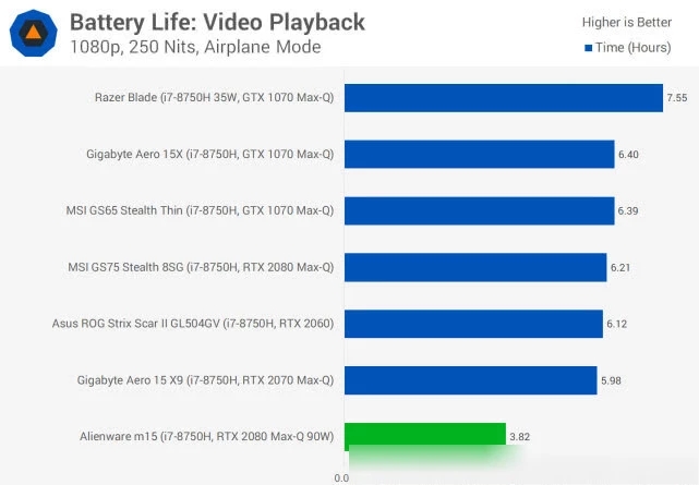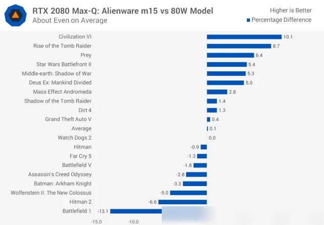 外星人M15的性能與80W RTX 2080 Max-Q大致相同,這款筆記本電腦與其他顯卡之間的差距非常相似。它比RTX 2070 Max-Q快10%,所以如果你在不同的外星人M15顯卡配置之間猶豫不決,這是你會感興趣的表現。