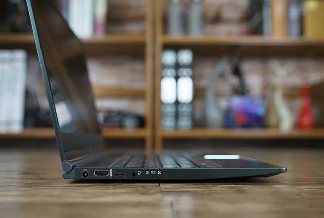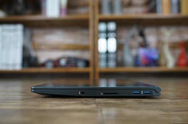 機身右側從左到右依次是防盜鎖孔、SD讀卡器、Type-C接口以及兩個USB3.1 Gen1接口。與同定位的其他品牌輕薄本產品相比接口數量與種類方面具有一定優勢,更加適合商務辦公用戶使用。