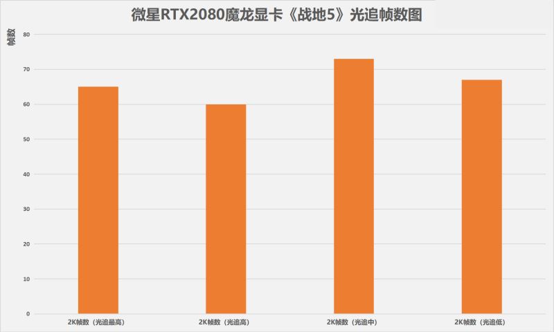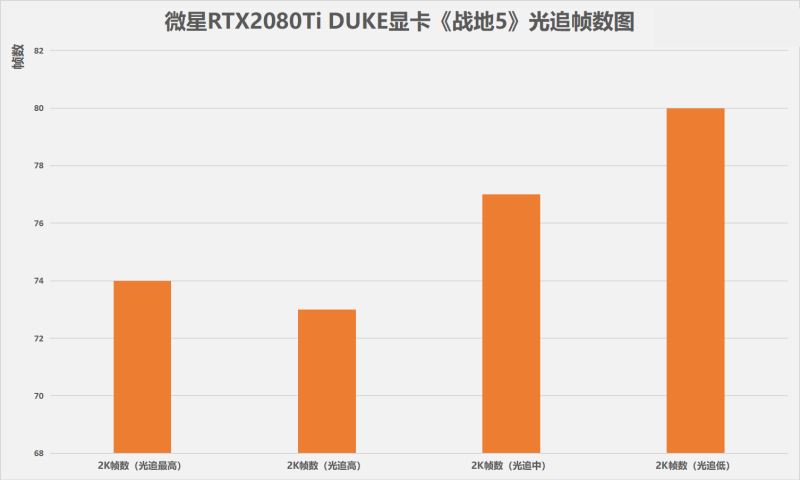 將分辨率調整為2K后整體幀數提升更大,在光線追蹤質量為低的情況下平均幀數能有80幀,不過光線追蹤質量最高的情況下平均幀數也有74幀了,僅僅是6幀的差距。所以用微星2080Ti黑龍顯卡玩《戰地5》比較平衡的狀態就是使用2K分辨率將光線追蹤質量開到最高。