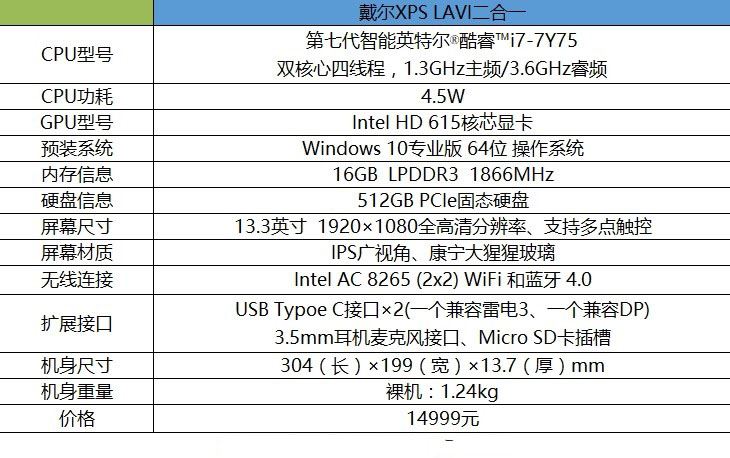 XPS LAVI目前共有兩種配置,本次拿到的為高配版機型,具體硬件配置方面,戴爾XPS LAVI二合一搭載 了第七代智能英特爾酷睿 i7-7Y75處理器、16GB內存、512GB固態硬盤、HD 615核芯顯卡、13.3英寸1920×1080分辨率的IPS觸控屏幕,預裝Windows 10 專業版操作系統,整體性能主流。