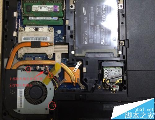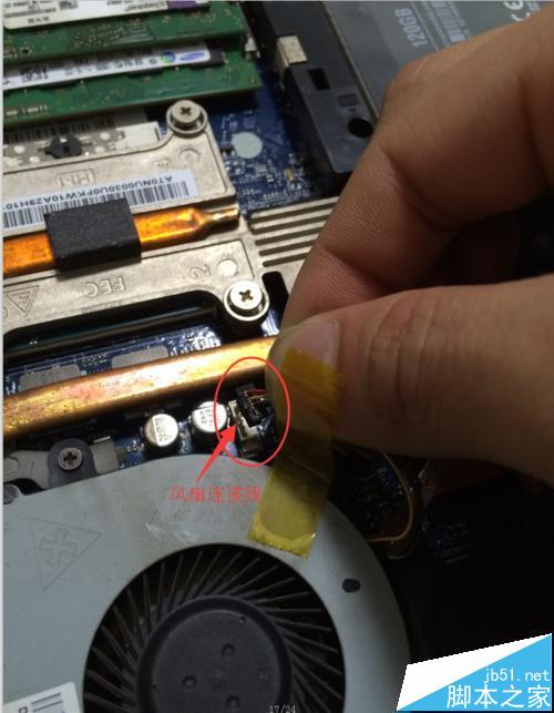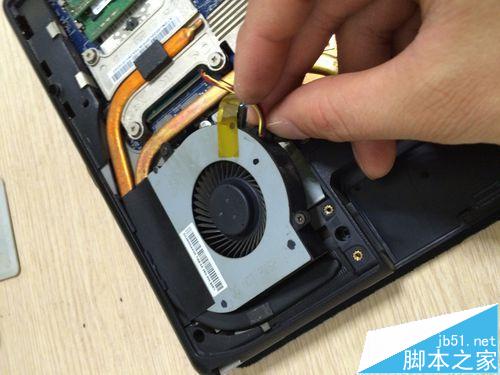斜30度方向,將風扇放置進去.先把風扇連接排線,插入(注意方向),然后將三顆螺絲擰緊.