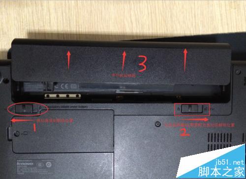 將筆記本關機,移動電源適配器連接后,必須將電池一同移除.按圖中所示方向(2處) 撥動滑塊至解鎖位置,電池向后平移推出
