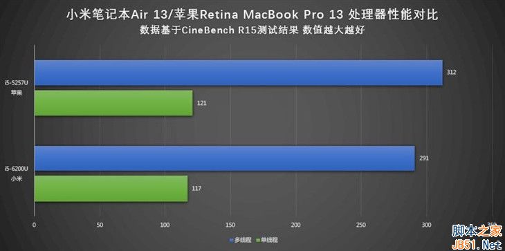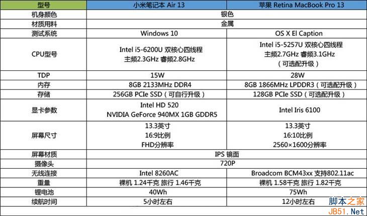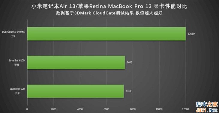 GPU性能上,1GB 940MX的3DMark CloudGate分數(shù)為12019,Iris 6100的分數(shù)則是7405。相比之下,蘋果MacBook Pro 13的圖形性能僅為小米筆記本Air 13的61.6%。