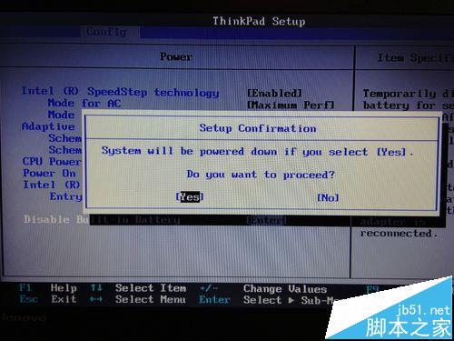 2、關機,拔掉t450的交流電源,用電池供電,重啟并按“F1”,進入bios,選擇“config”->“power”,再選擇“Disable Build-in Battery”,按下“回車”,選擇“Yes”,t450會立刻關機 。