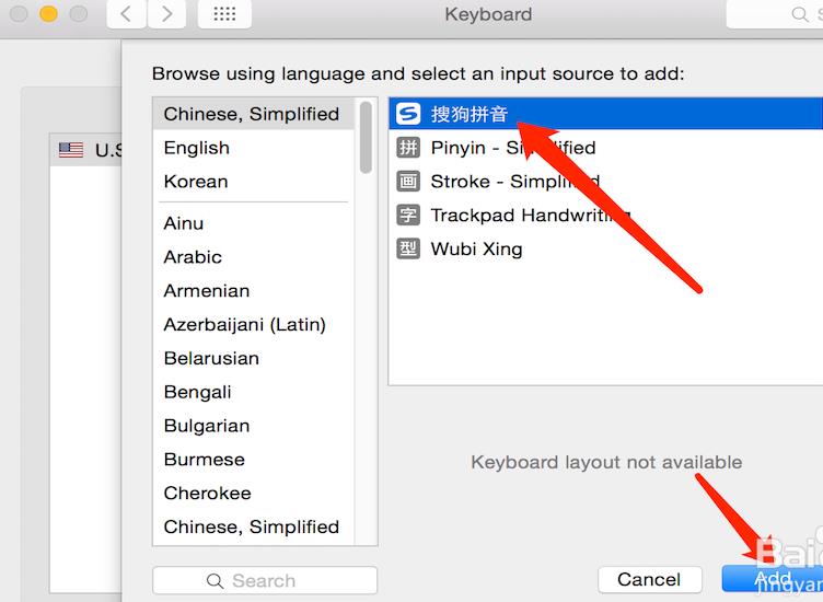 8、彈出的界面選中搜狗輸入法,點(diǎn)擊“添加”,就設(shè)置完成了。此時(shí)再進(jìn)行輸入法切換,就可以看到并使用搜狗輸入法了。