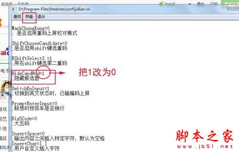 接下來我們在文件里找到“HideCandwnd=0”字行,把里面的0改為1,再點(diǎn)擊“存盤”,最后“退出”,即可完成設(shè)置。