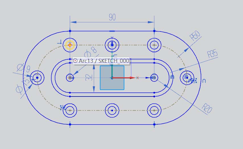 4、根據圖紙所給尺寸,繪出一系列的圓。此為開孔的圓,因較多且不均勻分布,所以先在草圖中繪好會比較方便。