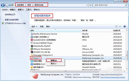 1、打開控制面板 - 程序 – 卸載或更改程序中找到xshell。選中xshell,右擊鼠標(biāo)選擇“卸載”。