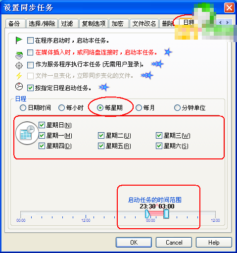(1) 在日程中選擇 “每星期”,然后選擇您想要備份的周期,如我選擇每天備份一次,則選擇星期一至星期日。