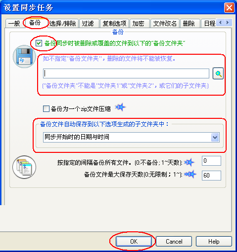 (1) 選擇“備份同步時被刪除或覆蓋的文件到以下的 “備份文件夾””