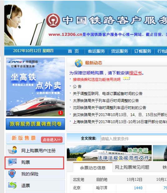 2、在12306主頁(yè)點(diǎn)擊左側(cè)購(gòu)票。