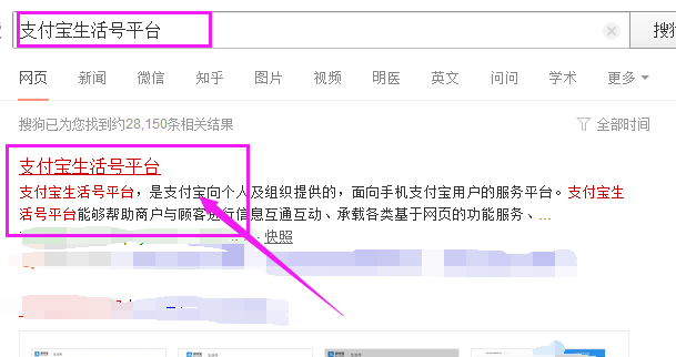 1、打開瀏覽器,輸入“支付寶生活號平臺”進行搜索。找到官網地址并點擊。