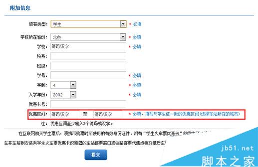 3、填寫學生購票相關的身份信息,然后點擊“提交”。步驟2-3如果沒有做,則學生票無法購買。
