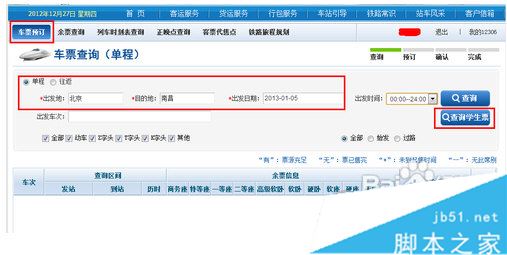 4、進入車票預訂 ,輸入乘車的起始站和終點站以及乘車時間,然后點擊“查詢學生票”搜索。
