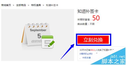 3、兌換知道補(bǔ)簽卡需要50財(cái)富值,點(diǎn)擊兌換的按鈕即可成功兌換。