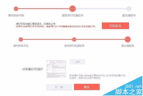 5、填寫并上傳投訴資料,生成打印通知書,上傳加蓋公章或簽名的通知書。提交后審核人員進行審核并反饋結果。