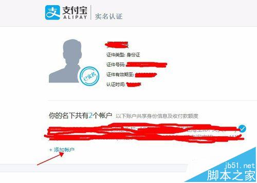 6、到了最后一步了,我們點擊如圖中所示的”添加賬戶“,就可以實現一個身份證關聯幾個支付寶賬號了