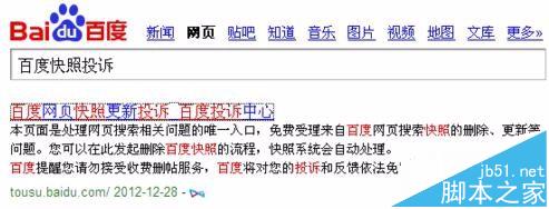 1、首先,在百度搜索中輸入【百度快照投訴】關鍵字,排名第一的網址就是官方的快照投訴刪除處理中心,點擊進入即可。