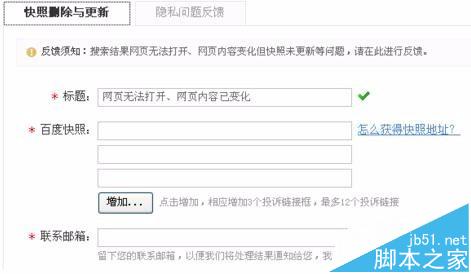 2、然后,根據此頁面的填寫項目,填寫想要刪除的快照標題、地址、聯系郵箱等,凡是標了紅色星號的都是必填寫項。