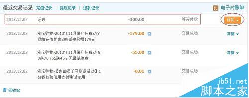 9、然后把朋友的支付寶退了,登陸我的,立即有消息提示,在最近交易記錄里,可以看到一個等待付款的記錄。點擊付款進入。