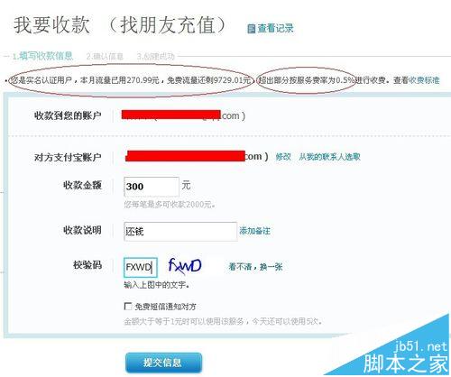 5、在彈出的“我要收款”頁面處,你可以看到該用戶的一些信息,然后填寫好金額,說明及驗證碼后,提交即可。