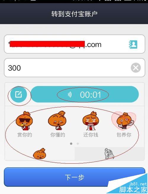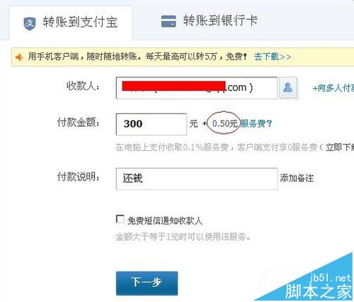 4、這里大家都懂的啦。輸入要轉入的支付寶帳號,下面是要轉的金額。下一步。下方有三小功能,你喜歡吧,有沒有都可以的。