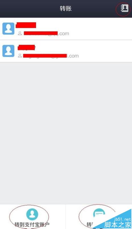 3、首先看到的是曾經轉帳的記錄,不管這個,我們來看功能,如圖:右上角是可以通過通訊錄來轉帳的,真TM的方便,我還沒用過。右下方是通過銀行卡來轉,我今天用左下方的轉給支付寶來描述吧。