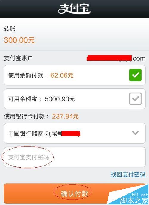 5、當你的支付寶余額不夠時,會默認使用銀行卡的錢。當然,如果你在余額寶后面打勾的話,那不夠的錢是在余額寶里扣的。然后輸入你的支付寶支付密碼。確認。就完成了轉帳。
