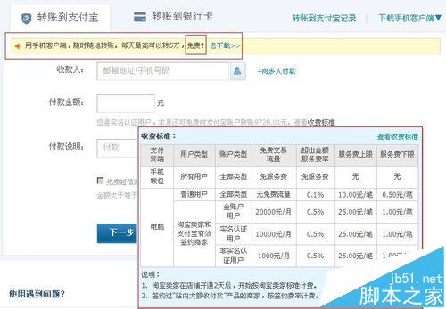 1、第一種方法,應該大家都耳有所聞吧。就是用移動客戶端(手機)來轉帳。登陸淘寶號,去到支付寶頁面。點擊轉帳,當然你也可以直接登陸支付寶,再點擊轉帳。如圖,我們先看一下手續費標準吧。免手續費的第一種方法,點擊上方“下載手機客戶端”。