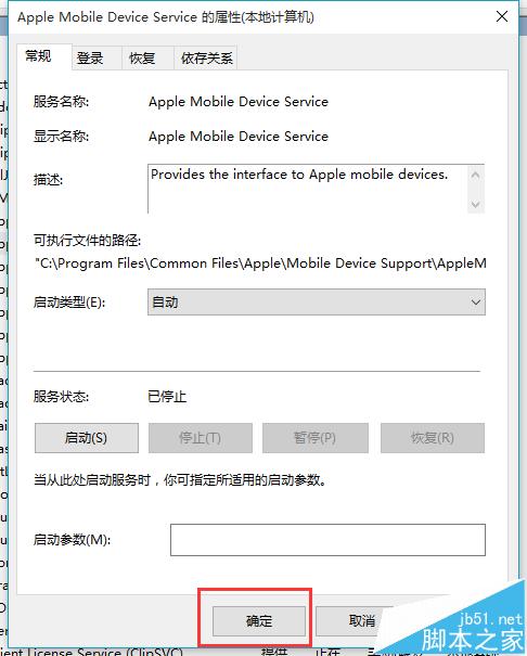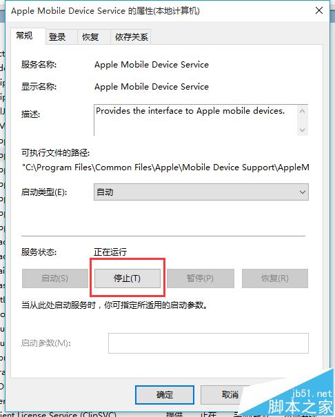 6、進入Apple Mobile Device Service屬性設置頁面,在“常規”欄目下可以看到“服務狀態”目前處于正在運行,點擊下方的“停止”按鈕