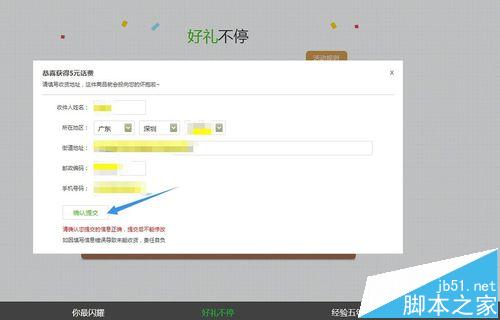 5、點擊抽獎,一次,兩次,最后一次,總有一次獎品在等著你,叮當,5元話費抽中了,窗口自動跳轉到填寫地址欄,仔細核對后,點擊確認提交。等活動結束后(11月10日結束),屆時會到賬。記得查詢哦。