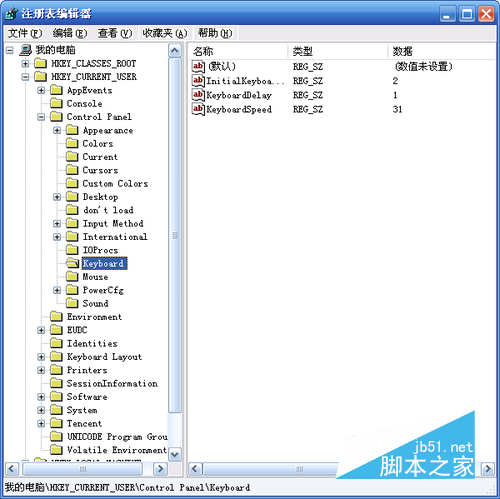 在彈出的“注冊表編輯器”中,依次選擇HKEY_CURRENT_USER——>Control Panel——>Keyboard