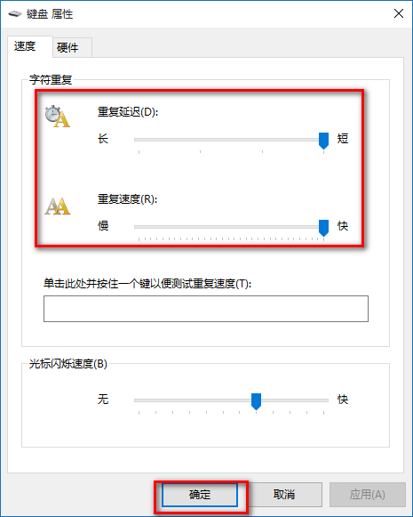 在打開的鍵盤屬性窗口,在字符重復欄,把重復延遲(D)的滑塊拉到最短位置,把重復速度(R)的滑塊拉到最快位置(如圖),然后點擊:確定。