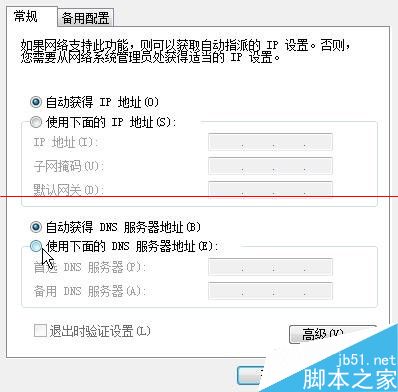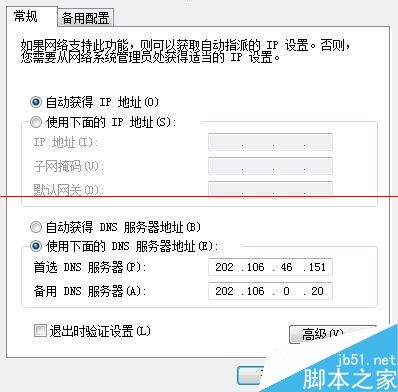 5、這時候,你看到系統默認是“自動獲得IP地址”、“自動獲得DNS服務器地址”,現在采用ADSL之類的撥號寬帶上網的用戶,一般都是這么采用默認設置的,這樣每次上網時,路由器都會自動分配給用戶一個IP地址,DNS服務器也就默認使用寬帶提供商的,我估計現在用的應該是觀滔寬帶的DNS服務器。