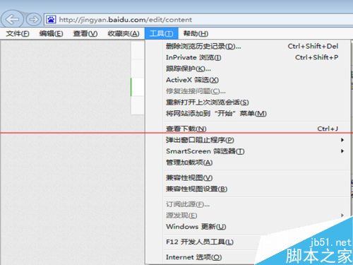 6、對付這些問題,進入IE的《工具》,選擇兼容性視圖設置,如果沒有找到工具菜單,在上方菜單條單點右鍵,選擇顯示菜單欄