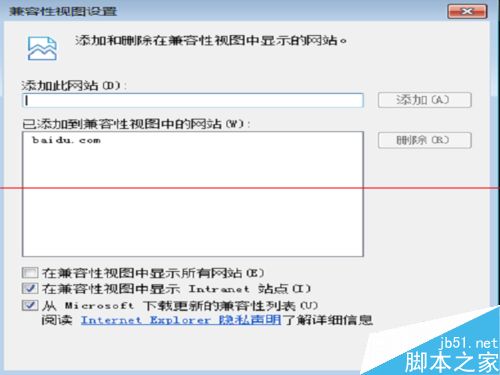 7、將網站單獨加入到兼容性設置中,或者選擇下方的以兼容性視圖打開所有網站的勾選,一切就OK了。