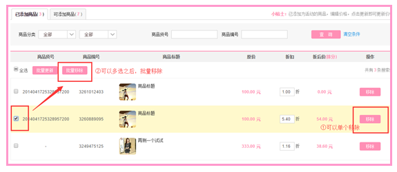 2)點(diǎn)擊“移除”或者勾選后“批量移除”即可把對(duì)應(yīng)商品從該活動(dòng)移除;