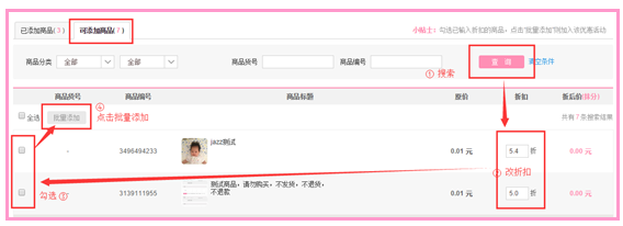 3)批量勾選要添加的商品信息,如果要更改折扣,則直接在輸入框進(jìn)行變更;